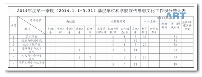 近期,公司党委宣传部发布了《2014年第一季度基层单位和学院宣传思想文化工作统计表》,其中公司相关宣传工作考评总积分在各学院中排名第一。