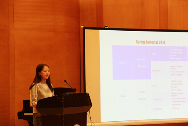 张捷经理在汇报会上发表了热情洋溢的讲话。她用了三个关键词表达了观摩感受。一是祝贺,她认为访学活动有助于专业能力的提升,国际艺术视野的开拓,和行业专家人脉的建立。此次赴意之行中欧洲艺术气息和氛围的感染和渗透,将成为师生一生宝贵的财富;二是感谢,感谢学校尤其是国际合作交流处和教务处,对学院访学活动的支持;三是希望,她介绍了学院所搭建的国际合作交流平台,希望同学们能够积极地对自己的学业、专业和职业道路进行思考和规划,充分把握每一次适合自己的机会。