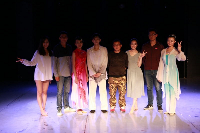 师生们在做舞蹈灯光效果最后调整