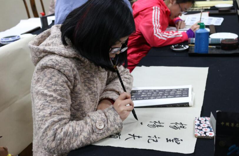 正式上课前,每位学员面前都摆好了笔墨纸砚。一切准备就绪,学员们就开始对照着自己喜爱的字帖,专心致志地临摹起来。张其凤教授则时不时地走到每位学员身旁,对他们的习作加以针对性的指导。除了技法上的指导,张老师还特别讲到研习书法的心境,“字不是靠手而是靠心写出来的,一笔一划中都蕴含了你的心境,只有静下心来才能在书写的过程中有所收获。”