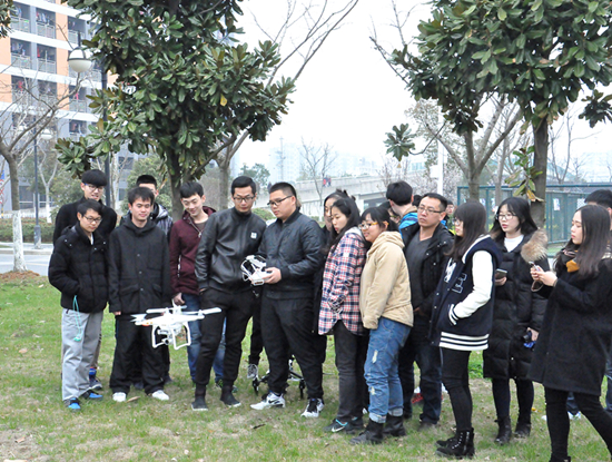 讲座结束后,王钰霖与师生们来到东区南草坪进行了航拍飞行器的现场放飞,并向同学们展示了精彩的飞行技巧,亲自指导现场的员工操作试飞了无人航拍飞行器。现场气氛热烈,同学们都跃跃欲试,轮番上阵操作飞行,表现出了浓厚的学习兴趣。