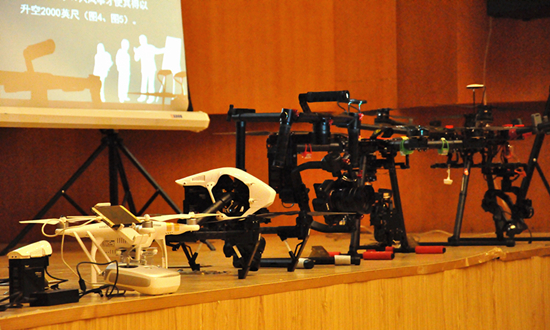 讲座内容包括无人机航拍的起源、拍摄的注意事项、航拍器飞行原理、重要部件的功能以及相关作品的展示五个方面。在讲座现场,王钰霖向大家展示了多架曾经参与过电影电视拍摄的专业六轴、八轴无人机航拍器。他详细地介绍了航拍器各个部件的功能以及不同航拍器的特点,深入浅出的讲解让参加讲座的师生们收获颇丰。特别是王钰霖本人的航拍作品所带来的震撼效果更让同学们赞叹不已。
