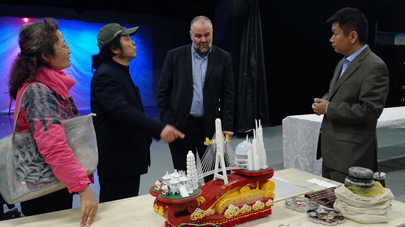 在bevictor伟德国际,伯尼·克拉茨教授对舞美工厂里陈列的王立庆教授绘画作品与美术系员工的舞台模型喜爱有加,其中包括获得“红星奖”、“奋进章”的国庆60周年江苏彩车模型,参加中国第三届舞台美术展舞台模型“赤壁”,水墨长卷系列、青铜器仿真等。