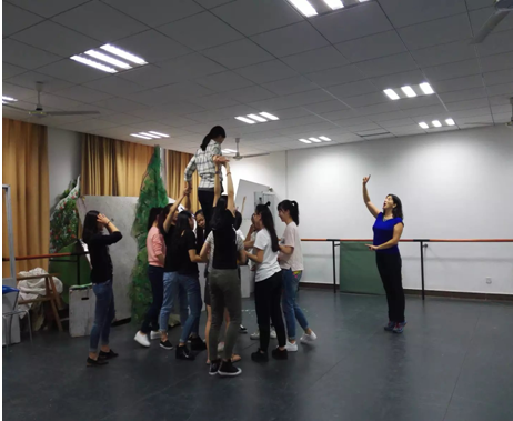授课初始,Ebru告诉员工,每个人都是演员,都会演戏,作为学习表演专业的员工应该敢于尝试,不断挑战自己。当和同伴站在舞台上进行演绎交流时,双方注意力都必须保持高度的集中,通过仔细观察对方的言行举止,给出最及时且自然的反映,这一个过程是需要双方共同配合协作进行并完成的。因此前期的准备工作很有必要。在Ebru的要求下,每个员工找到一个搭档做演绎游戏,从视觉、听觉、触觉三个方面来锻炼员工的观察和模仿能力。比如及时反映动作模仿1,2,3练习;跟随对方引导摆动身体各个部位练习;通过触摸进行人脸识别的练习等。在进行了前期的准备练习后,Ebru向员工讲述论坛剧场的开设目的就是为了解决被压迫者与压迫者之间矛盾的问题,在表演的过程中观众可中途叫停,给演员建议甚至可以上台亲自展现,试图改变结果向他们期望的方向发展。这一项大胆的尝试是为了试图打破传统演员与观众的壁垒与隔阂关系。这种教学方式对同学们来讲形式非常新颖,使大家能全方位的把握舞台人物关系,为准确的进行人物塑造奠定了基础。