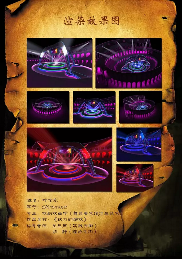 展演同时,部分同学也阐述了自己的设计思路,叶龙彪同学的《权力的游戏》舞台演出空间设计借鉴古罗马剧场与古罗马斗兽场,设计中考虑到表演区下带有分开的台仓,方便升降机械器材,除了凶残的竞技、斗兽、还有戏剧、歌舞表演等,另一创新思路就是可以在场地内注满水表演海战。金穆同学油画写生作品《树下余晖》从夕阳风景里获取灵感,既没有将自然细节一一列举,也没有幻想的风景那样思辨。从自然中来,一目了然的将画笔用“说故事”的方式回归到自然里,将油画呈现。张兴年同学舞美设计《莫愁女》江南可采莲,莲叶何田田。《莫愁女》舞美设计中主要采用了莲花、莲叶、水波、红色江南窗格等设计元素,莲花、莲叶、水波用三层喷绘布最为吊景,通过灯光渲染出通透、空灵的荷塘景象。陈雪艳同学作品是基于“一带一路”背景下进行的传统工艺美术作品的视觉化展示研究,选取“一带一路”中各个重要区域的传统工艺美术作品,通过手绘、模型、文创设计等多种创新视觉展示方式进行展示,深化大众对“一带一路”背景下传统工艺美术文化的系统认识。