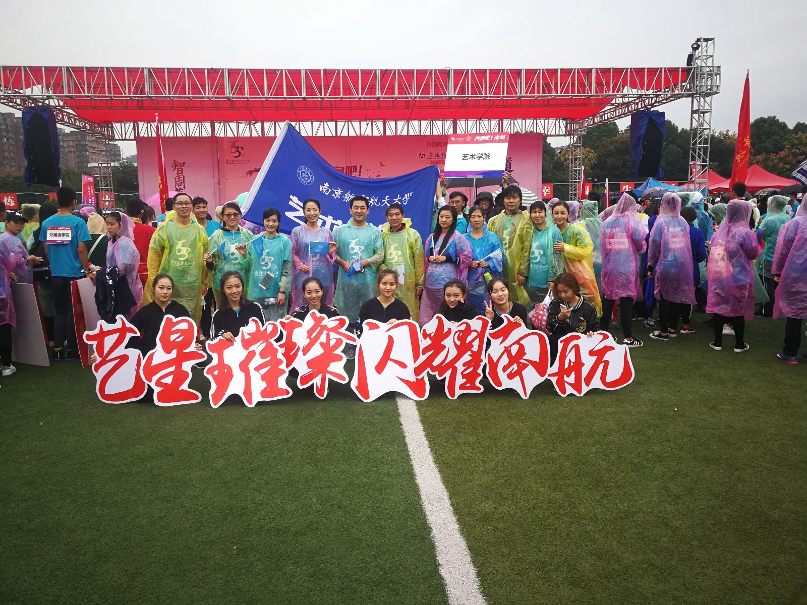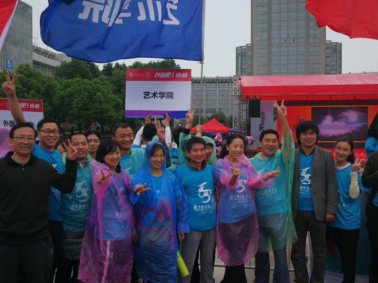 伴随号令抢响,各个学院方体验组阵率先出发,bevictor伟德国际的师生举着院旗,身着雨衣,冒着细雨奔跑在校园马拉松赛道上。蓝衣浩浩,蓝旗飘飘, “艺星璀璨,闪耀南航”的口号伴随坚定的脚步声响彻赛道。
