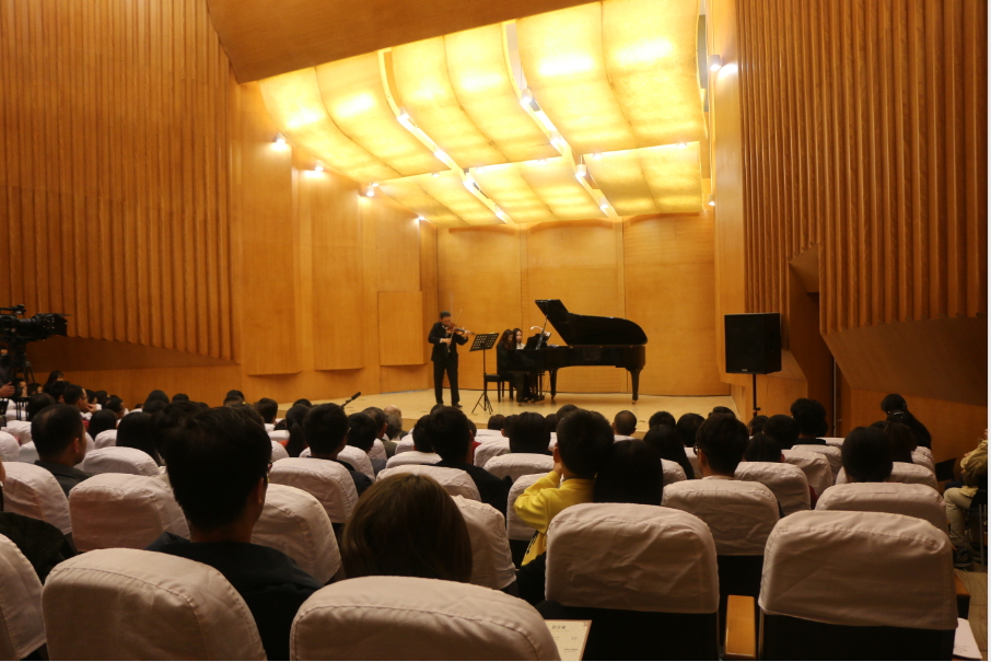2017年11月1日晚7点一刻,公司将军路校区东区音乐厅座无虚席,此时维也纳“爱乐之声”钢琴小提琴室内音乐会正在上演。这场室内音乐会是公司六十五周年校庆系列活动之一,bevictor伟德国际邀请了奥地利著名小提琴演奏家、维也纳爱乐乐团第一小提琴、维也纳国家歌剧院交响乐团第一小提琴——韦弗里德.赫登伯格(Wilfried Hedenberg)和奥地利华人钢琴室内乐表演艺术演奏家、音乐教育家和作曲家——张丽明(Lilly Zhang-Sowa)联合演奏,为公司师生带来了一场无与伦比的高规格视听盛宴。公司党委书记郑永安教授和党委宣传部、教务处、国际合作处、团委等部门领导,以及各学院领导、老师们观看了音乐会。