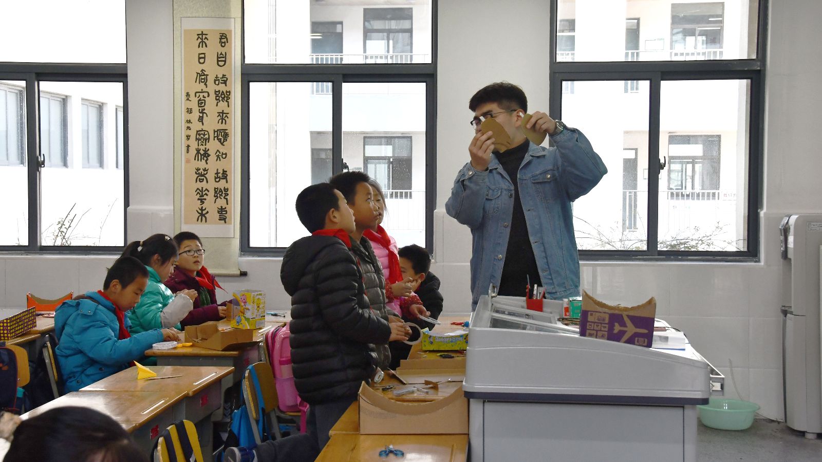 刚一站上讲台“盒子物语”团队的主讲人佟贺阳就问了孩子们一个问题:“现在每一位小朋友的家里面快递盒多吗,印象中家长们都是怎么处理的呢?”孩子们跃跃欲试举手回答:扔了;卖了……这堂互动性十足的手工课就这样开始了。团队成员们在课堂上通过启发式的讲解,为孩子们创设情境,在与孩子们交流的过程中向孩子们宣传环保的理念与快递回收的重要性。随后,主讲人佟贺阳问孩子们:“那我们看看快递盒能变成什么好不好?”“好!”孩子们异口同声的回答到。团队成员拿出事先准备好的快递回收盒分发给孩子们,教孩子们按照模具画出飞机的结构图,裁剪出来,拼成了一个栩栩如生的小飞机。就这样一个经常被人随意丢弃的快递盒摇身一变成为了一个手工艺品,孩子们笑着说:“真好玩”。