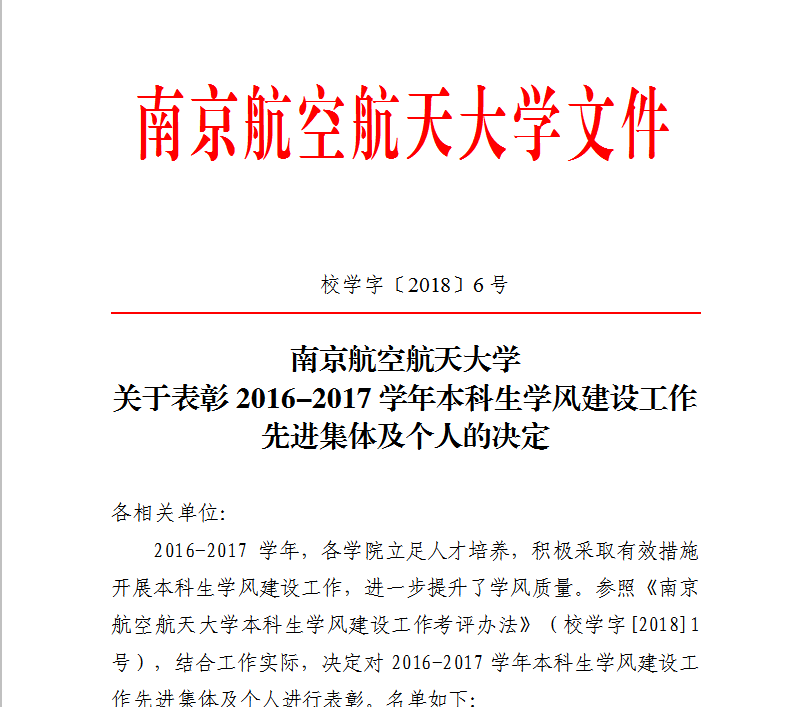 通过全院教师和员工的共同努力, 在南航2016—2017学年本科生学风建设工作先进集体及个人表彰中,公司荣获员工诚信奖、学困生帮扶成效基础奖及本科生学风建设工作先进个人,共三个奖项。在这一学年中,公司积极开展一系列有助于提高学院教风、学风活动。学风建设工作成效显著。