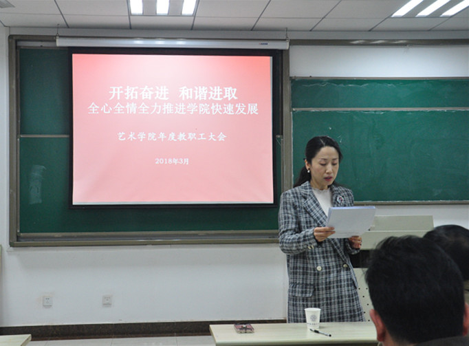 张捷经理紧扣学校第十六次党代会精神和学校学期初干部教工大会精神,结合学校对艺术办学的要求和定位,围绕艺术发展规律、专业学科特点和学院发展形势要求,从完善制度建设、加强团队队伍建设、推进学科交叉融合、教学科研团队建设、高水平教学成果和科研项目培育、开展教育思想大讨论、人才培养机制改革、年青教工培养、国际交流、艺术服务校园文化建设和人才培养、开放办学和党的建设等方面对学院年度重点工作进行了详细解读和布置。她希望全院教职工戮力同心,和衷共济,按照校十六次党代会提出的“一个中心、五路并举”的战略布局和学校新学期教工干部大会精神,找准学院融入和学校的突破口和着力点,探寻学院新时期发展的增长点,打破学科、专业界限,整合和利用学院和学校各类资源,寻求“艺术+科技”的协同发展特色之路,为学院的可持续及跨越发展开创良好局面。