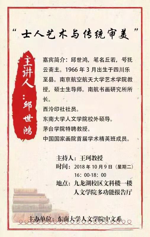10月9日,天朗气清,东南大学人文学院中文系金秋大讲座系列活动启动,邀请了多位全国名校专家举办了系列学术讲座,给东大学子带来了前所未有的精神大餐。东南大学人文学院校外硕导、南航bevictor伟德国际邱教授应邀参加,并以《士人艺术与传统审美》为题,为东大师生做了一场生动了学术讲座。东南大学中文系主任王珂教授主持了讲座。