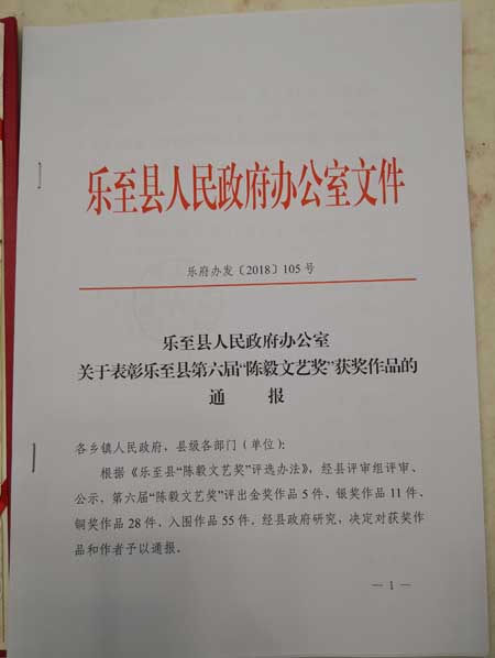 2018年秋,陈毅元帅的故乡四川乐至举行了第六届‘陈毅文艺奖’评选。据悉,乐至县“陈毅文艺奖”2006年设立,每两年评选一次,分为金、银、铜、入围四个奖项。通过初评、终评,本届“陈毅文艺奖”共评选出了99件作品获奖,其中入围奖55件、铜奖28件、银奖11件、金奖5件,作品涉及书法、美术、表演、摄影、纂刻等多个艺术领域。