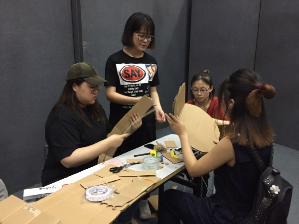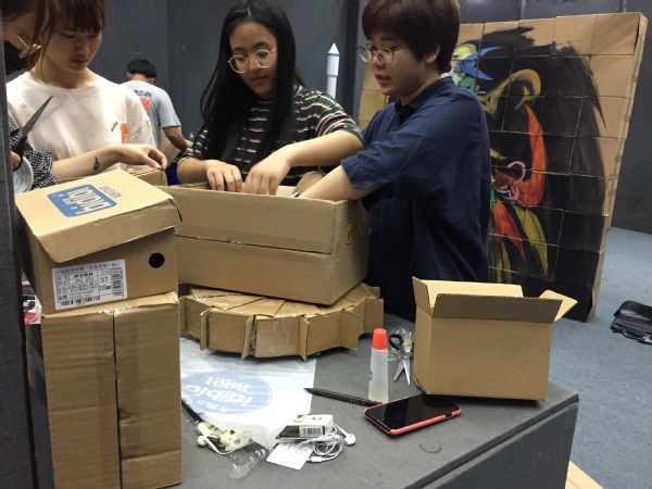 通过报名,共有6组团队参与到比赛中,他们来自不同的专业、不同的年级。比赛刚开始时,有的胸有成竹,面色平静,还有的茫然无措。经过团队协商,他们全都确定了自己创作的方向,迅速选好材料,然后全身心投入到了创作中。