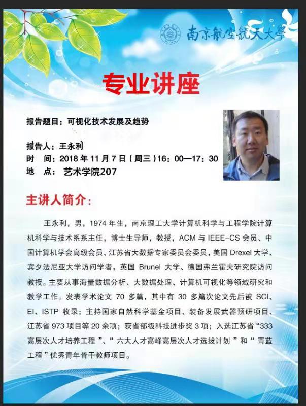 11月7日,南京理工大学计算机科学与工程学院计算机科学与技术系系主任、博士生导师王永利教授受邀来到bevictor伟德国际,为学院师生带来了一场关于可视化技术的专业讲座,分享了他在计算机可视化技术方面的最新研究成果。