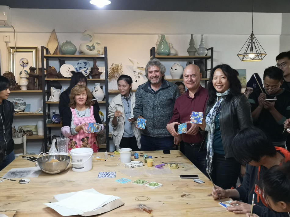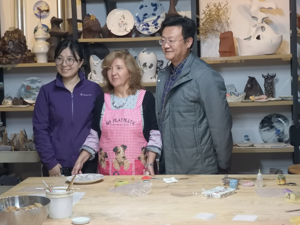(板俊荣副经理、工程训练中心徐老师和EMEL ŞÖLENAY 教授在陶艺工作坊)