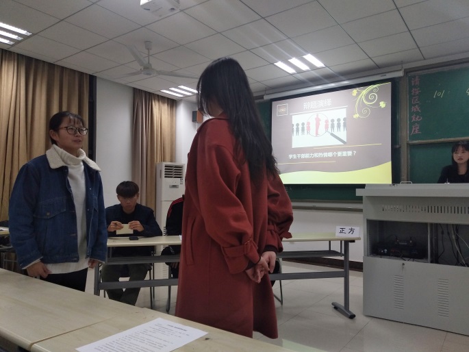 在两场辩论中,围绕“举办团活动质量和数量哪个更重要”这一辩题,音乐表演(歌舞)专业三名同学持正方观点,落脚于保质量增支持,提高同学对团日活动的认同感。而环境设计专业员工持反方观点,认为“通过数次的量的积累,可以充分调动每位同学的主观能动性,可以大大促进集体凝聚力与同学们的集体荣誉感,并为以后开展更加高质量的优秀团日活动铺平了道路”。在第二场辩论 “员工干部能力和热情哪个更重要”辩论中,各位辩手旁征博引妙语连珠,分别结合理论与现实论证了能力与热情的重要性,双方针锋相对互不相让,为大家奉献了一场有理有据的精彩辩论。经过五个环节的激战,最终1118401与1118501两个班级取得了这次辩题的胜利。