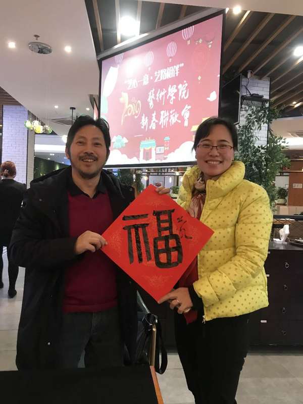 在活动现场,我国著名书法家、学院邱世鸿教授,泼墨挥毫,一气呵成,亲手撰写了对联和福字,引燃了联欢会的热烈气氛。