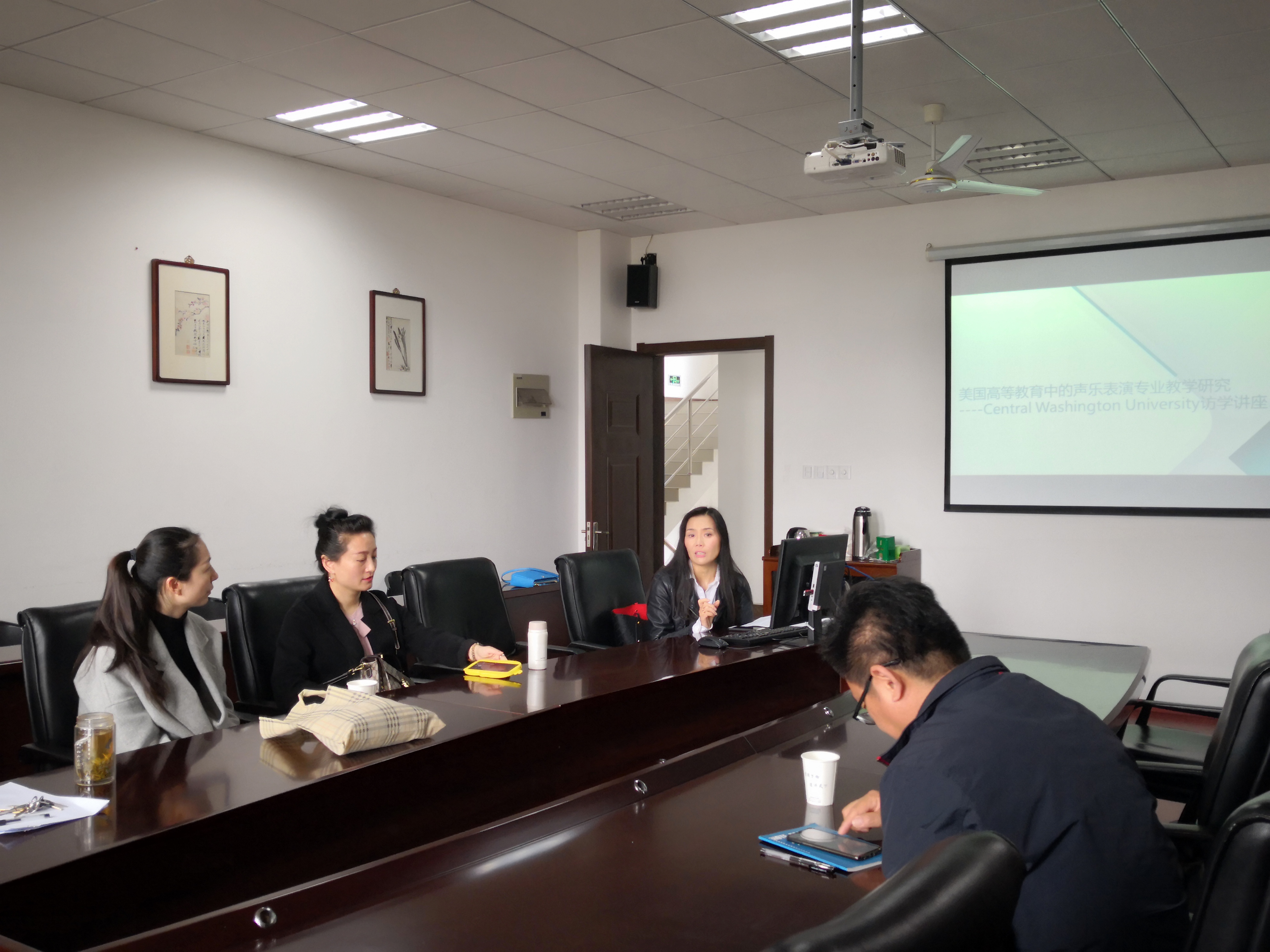 张进老师2018年3月至2019年3月在对中央华盛顿大学进行了为期一年的访学。她的报告首先介绍了中央华盛顿大学及其音乐专业概况。张老师指出,他们学校的员工在入学前的专业水平就普遍较高,且在入校后也很认真对待每位老师布置的作业,很少出现不完成作业的情况。其次对中央华盛顿大学音乐专业课程及教学活动做了介绍,课程从团队力量、教学内容、教学形式进行了详细的讲述,并和公司的情况进行了对比。张老师指出,中央华盛顿大学音乐专业的课程设置和公司差不多,只是在实践活动上比我们多很多,在他们那里让员工参与的力度更大,员工收获的东西就会更多。比如:他们要求本科生就要开专场音乐会,并且纳入到学分中去。张进老师还指出美国教育中的“自由开放”和“严谨统一”的辩证关系。美国对员工首先是自由开放的,可以任意转专业(只要通过考试),不歧视任何特殊情况的员工,但是对所有员工的学术要求都是一样的,没有人情可言。张进老师还对声乐专业课程设置以及实践情况,从教师专业性、课程实用性、学校全面性、师生互动性这四个方面做进一步的讲述。张老师在访学学习期间还举办了两场个人音乐会及各种合唱音乐会的排演。并且受到校方的一致好评。在音乐会后,张老师还收获了许多小粉丝,并且他们希望假期到中国来和张老师学习声乐。张进老师表示,虽然访学很辛苦,但是看到她的导师和其他老师们那么的热情,所有的付出都是值得的。