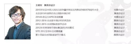 现任北京北奥盛典国际文化有限公司的舞美总设计,从业十一年的设计师,先后在2014年水立方APEC欢迎晚宴,2015年抗日战争胜利70周年纪念活动及北京2015、2017年奥林匹克公园新年倒计时等近17个重大的国际、国内活动中担任舞美总设计,这些都是王晓军头上的光环。