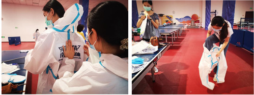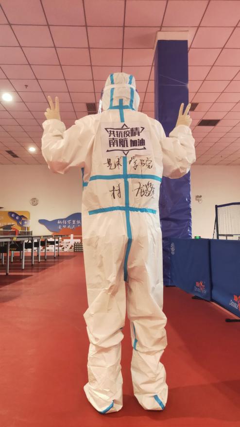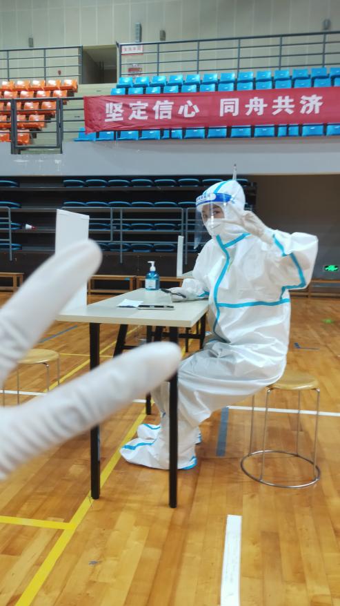 早上八点半,志愿者们在将军路校区体育馆集合,接受培训后换上防护服,从头到脚武装起来。“终于理解那个上门给人做核酸在楼下苦等无果后大哭的医护人员了!”在当天的朋友圈中,20级新闻与传播专业的硕士研究生田点这样写道,“穿上防护服的感觉像焖锅,穿了10分钟就感觉热到不行,手套褪下来后汗水直接拧成几股流下来了。”